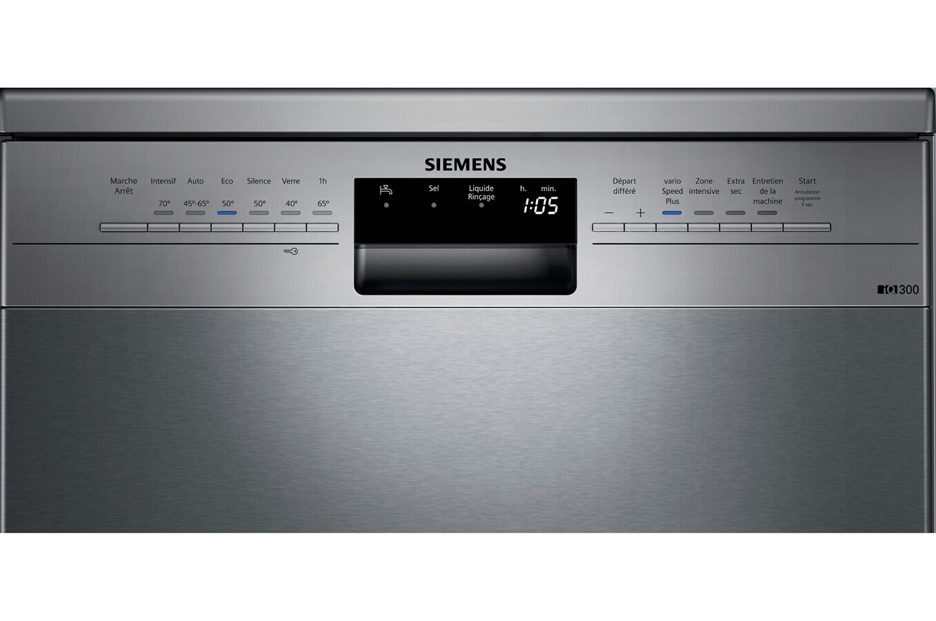 Programmes spécifiques: Intensif 70°C, Auto 45-65°C, Eco 50°C, Silence 50°C, Verre 40°C, Programme 1 h 65°C