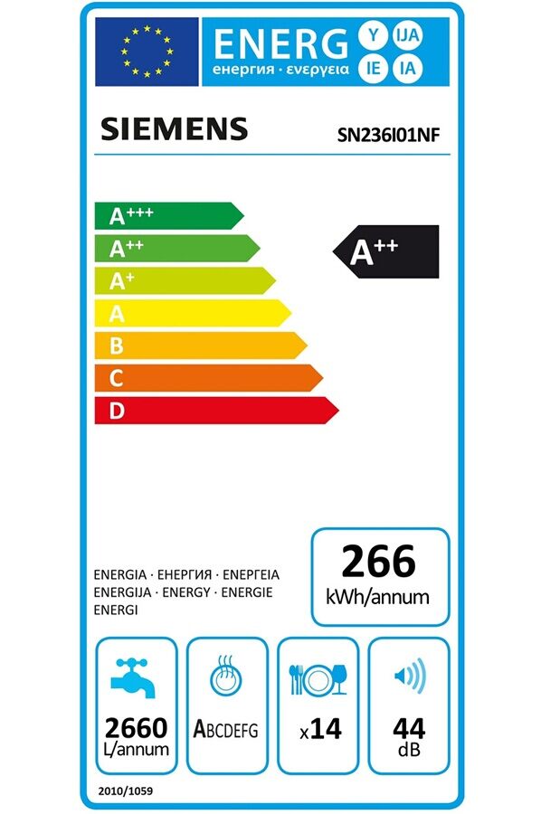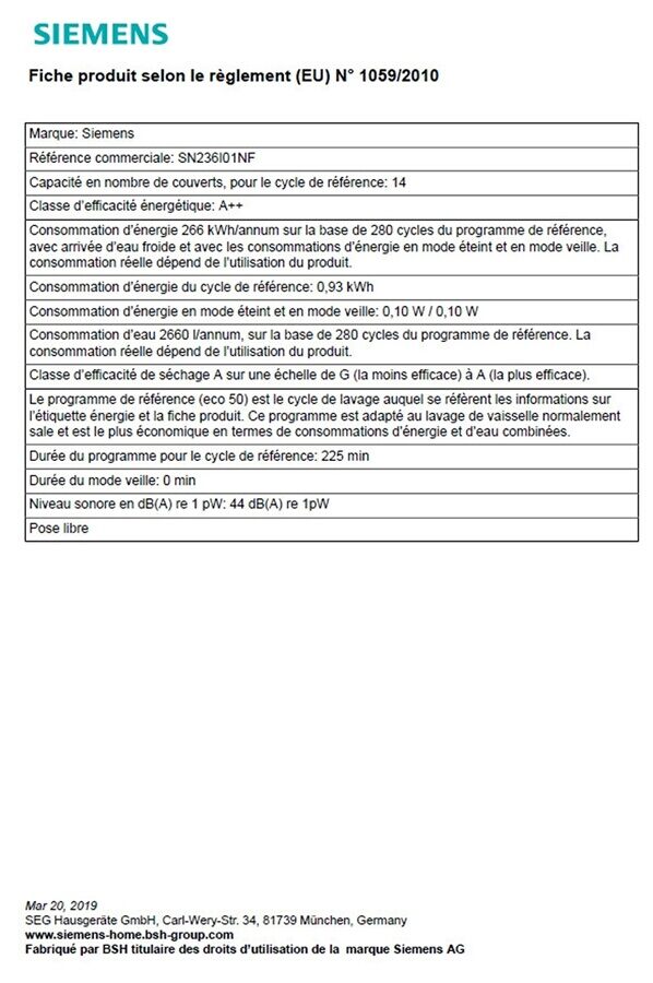Ce lave-vaisselle Siemens SN236I01NF  Inox est doté de  6 programmes dont le  programme silence qui permet un niveau sonore de 41 dB, il se fera vite oublier !  3 options : VarioSpeed plus (3 fois plus rapide) , Zone intensive et  Séchage extra. Pratique, il est équipé de  Paniers et  Tiroir à couverts VarioFlex, qui permet un gain de place et d’un  Moteur iQdrive, plus silencieux et plus performant. Ultra-basse consommation, il bénéficie d’une  classe énergétique A++. Economique, ce lave-vaisselle consomme en moyenne  20 % moins d’énergie par rapport à un modèle classe A.