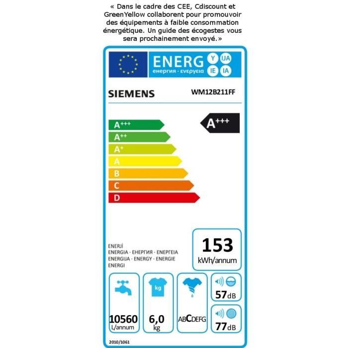 | Nom du produit | SIEMENS WM12B211FF – Lave linge frontal – 6 kg – 1 |